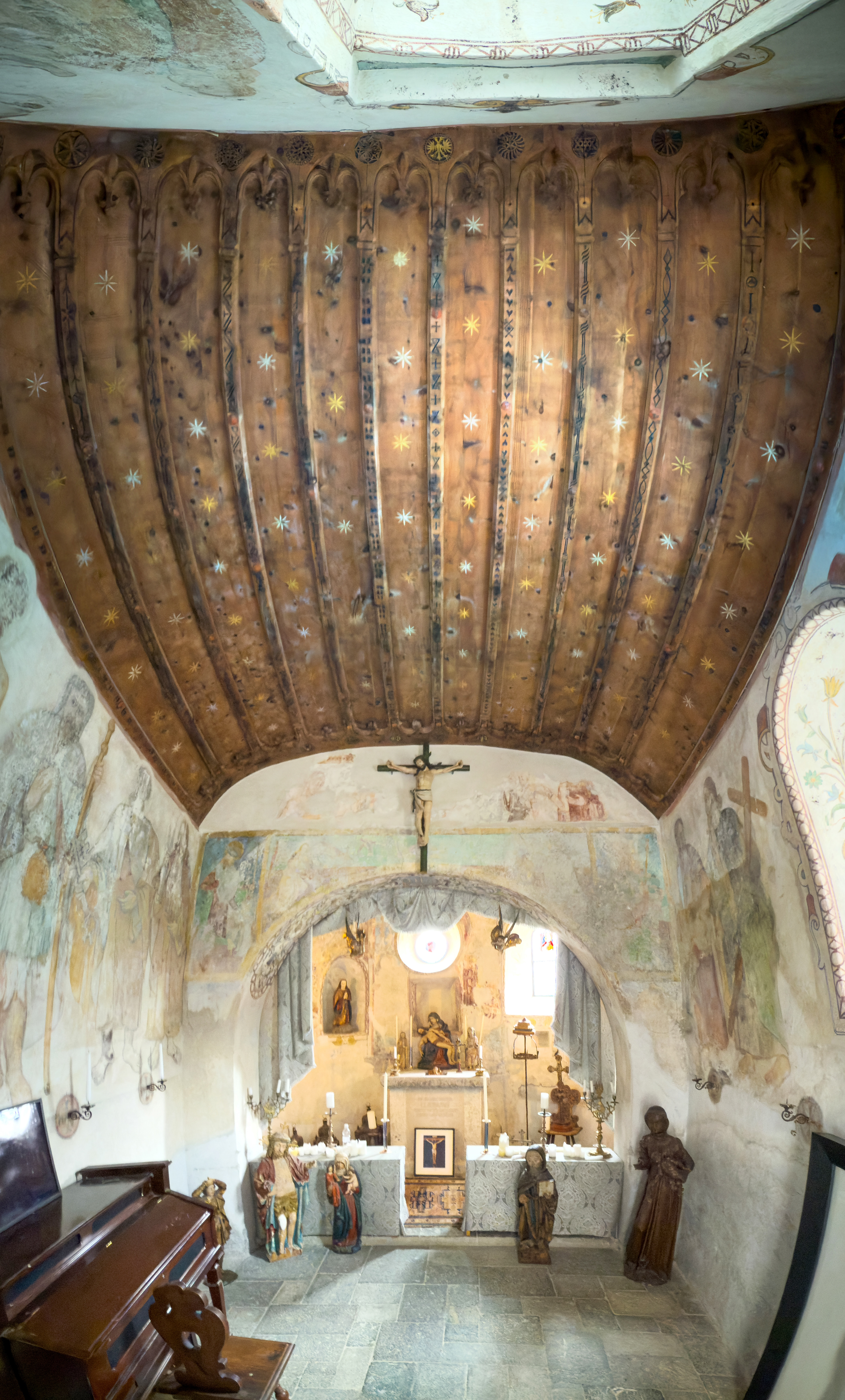 Sent im Unterengadin: Den hochgotischen, nach Süden ausgerichteten Chor dieser reformierten Kirche umrunden zwei Bankreihen, 31. Oktober 2022, 16:25 Uhr.